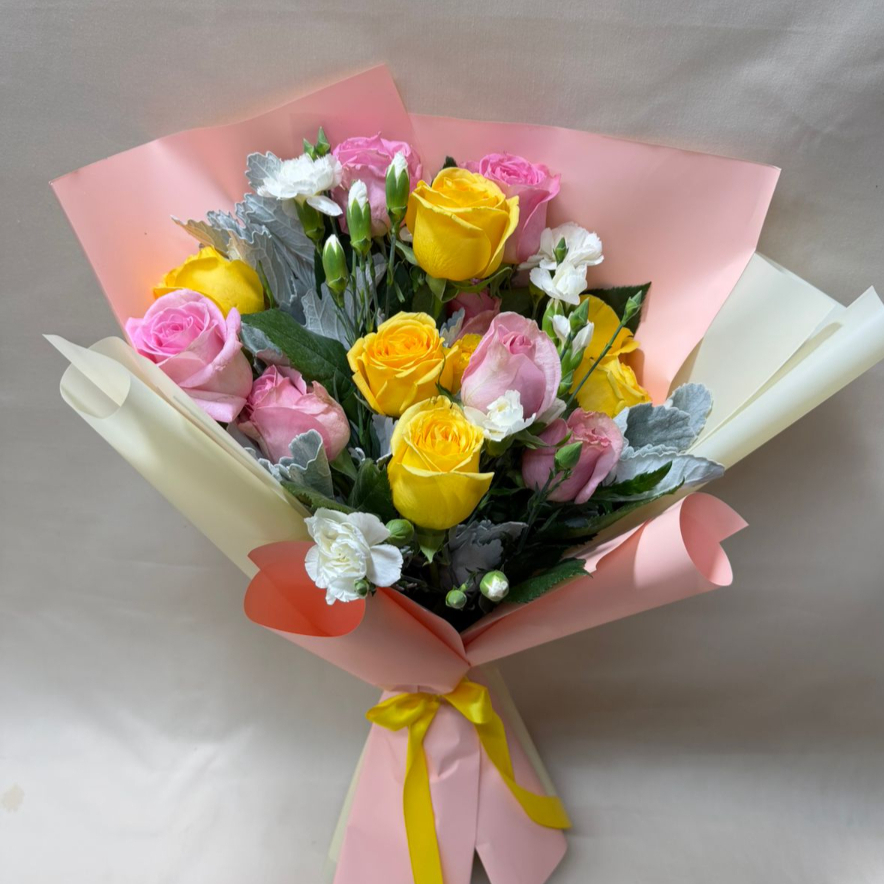 Bouquet con 14 rosas en tonos amarillo y rosa, clavelina blanca, acompañado de miller como follaje, (las tonalidades y follajes pueden variar según disponibilidad en tienda).