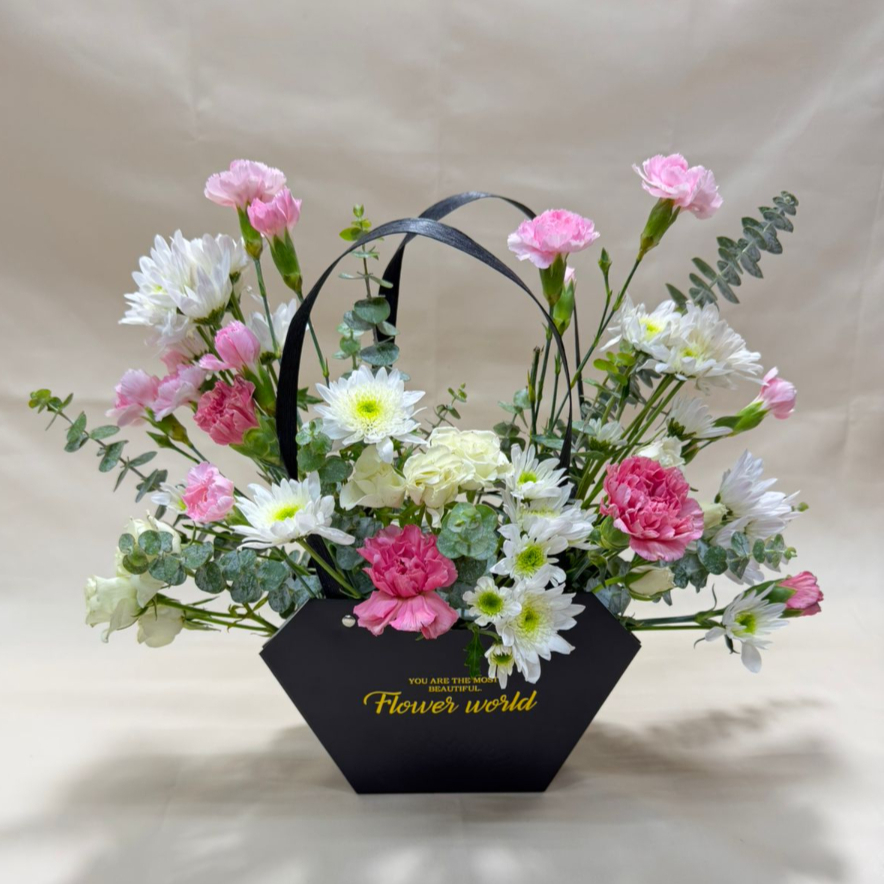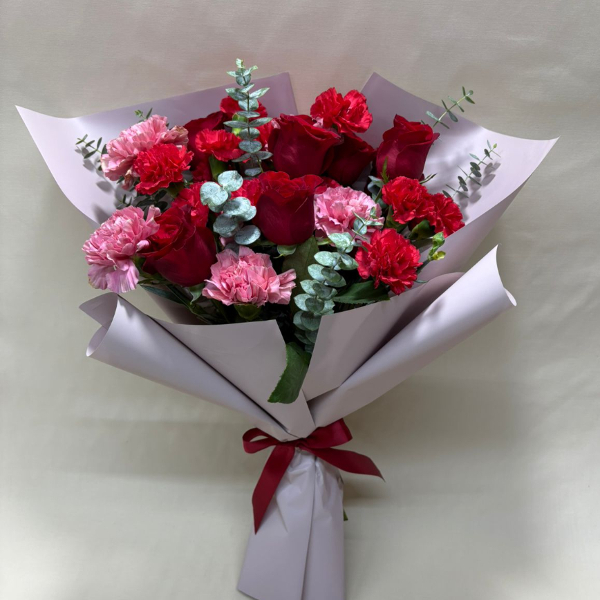 Ramo de 7 rosas, claveles rojos, claveles rosas acompañado de dolar, (las tonalidades y follajes pueden variar según disponibilidad en tienda).