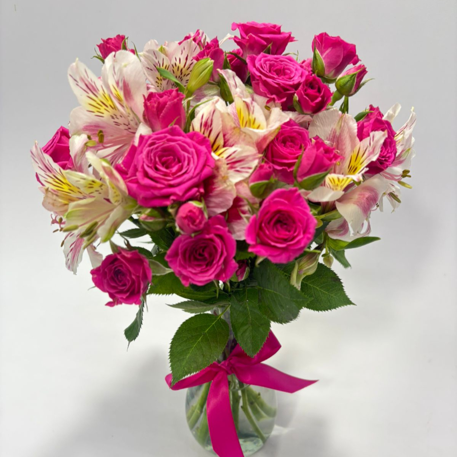 Florero con mini rosas fiucsa y astromelia (las tonalidades y follajes pueden variar según disponibilidad en tienda).