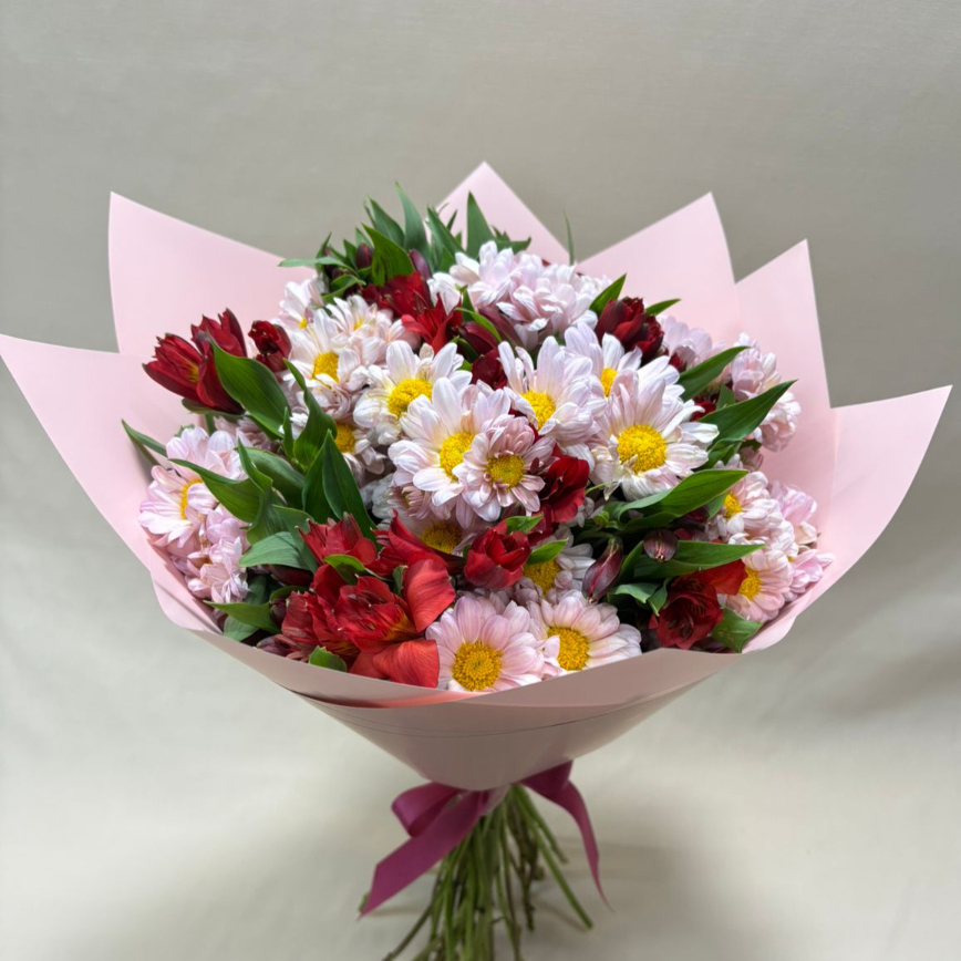 Ramo de astromelia roja, margaritas rosas (las tonalidades y follajes pueden variar según disponibilidad en tienda).