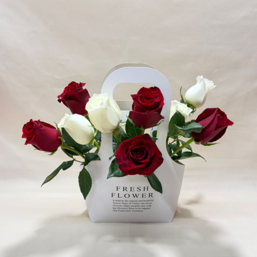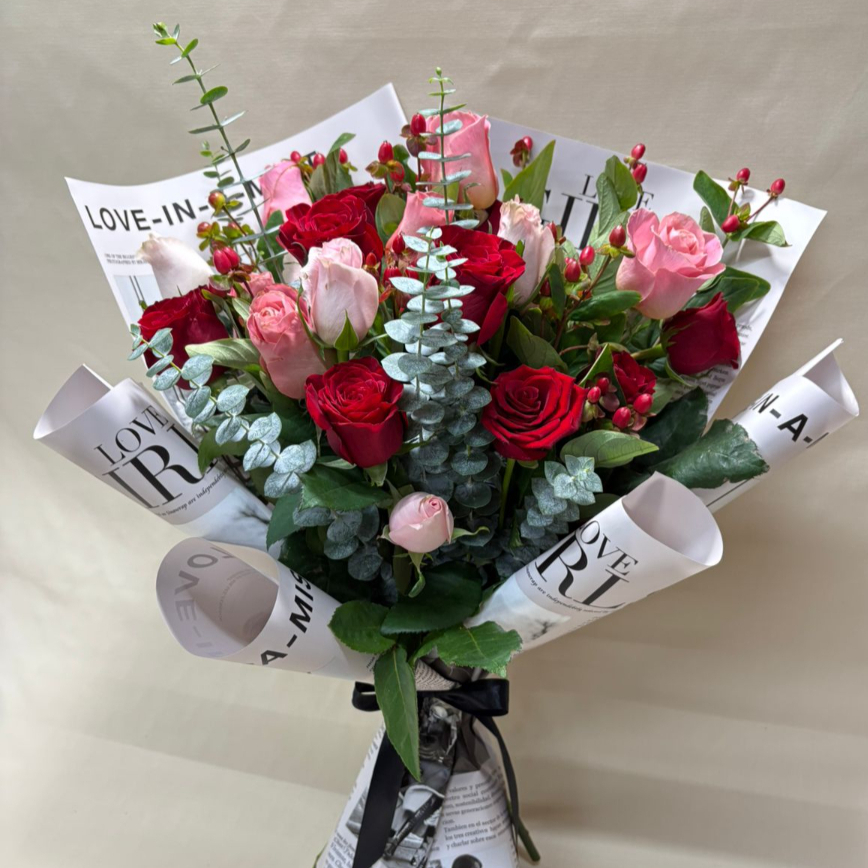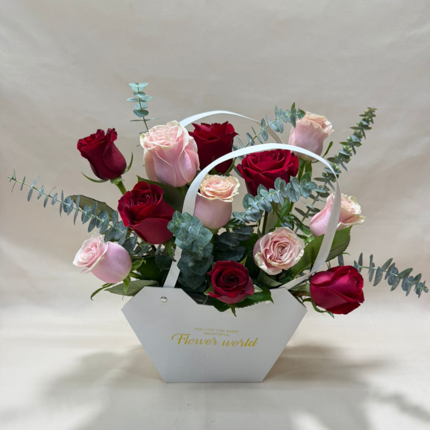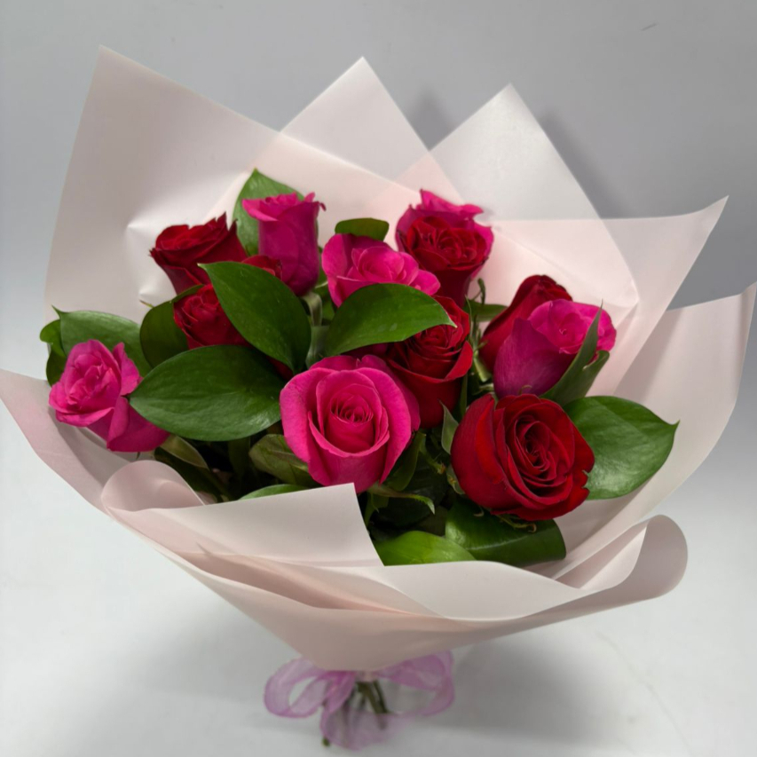 Ramo de 12 rosas, 6 color rosa, 6 color rojo, acompañado con ruscus como follaje (las tonalidades y follajes pueden variar según disponibilidad en tienda).