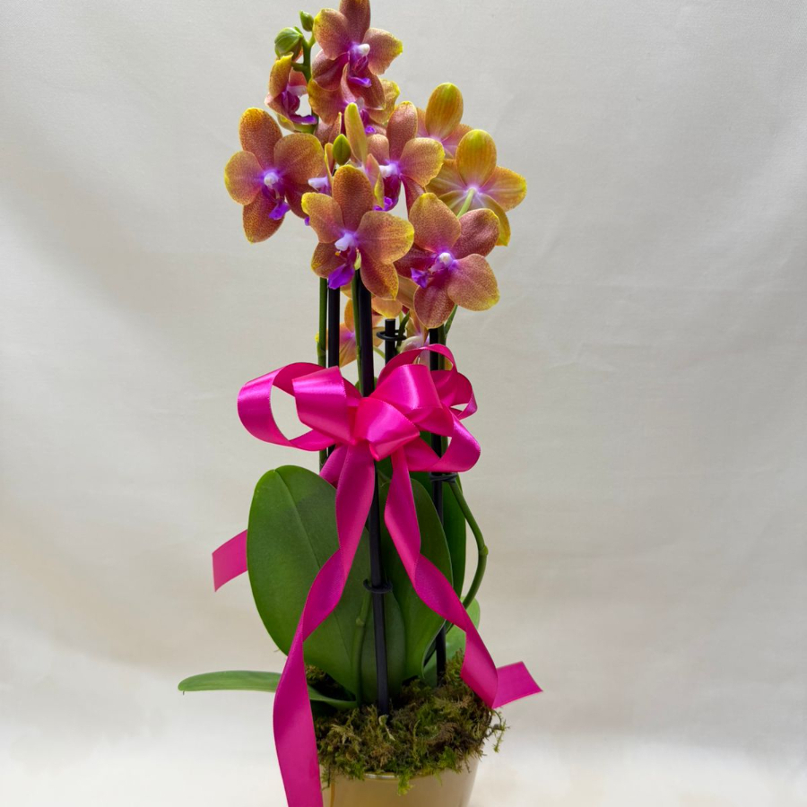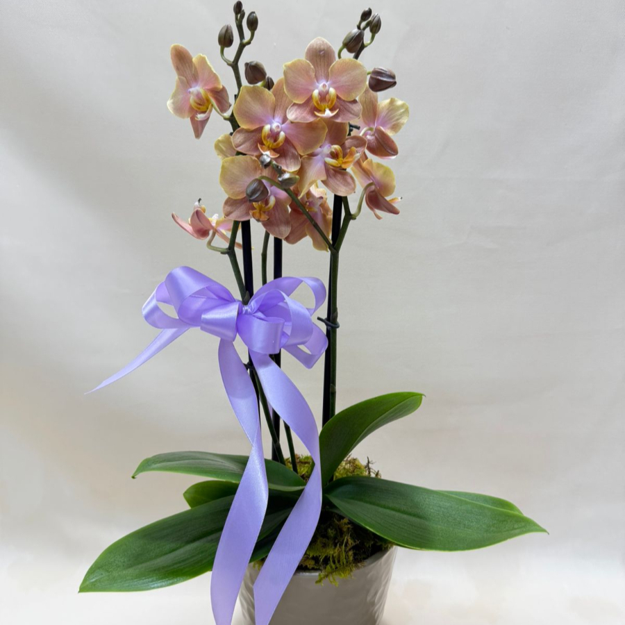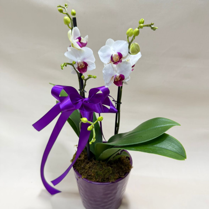 Maceta de cerámica con mini orquídea y moño, (las tonalidades pueden variar dependiendo la disponibilidad en tienda )