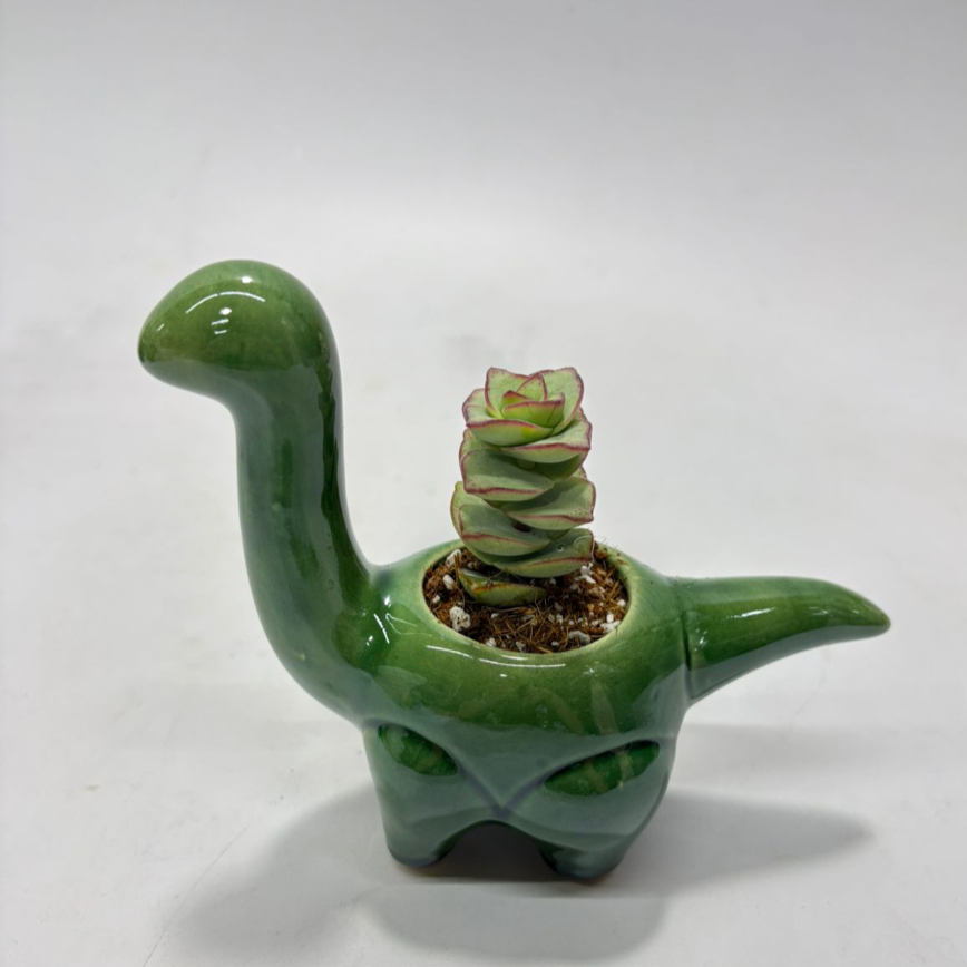 Maceta mini en forma de dinosaurio con suculenta Crassula Perforata