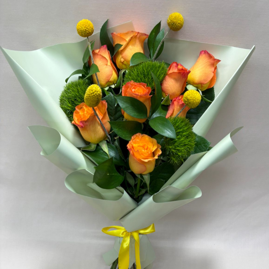 Ramo de 8 rosas naranjas, 4 craspedias, 3 green balls, acompañado ruscus como follaje (las tonalidades y follajes pueden variar según disponibilidad en tienda).