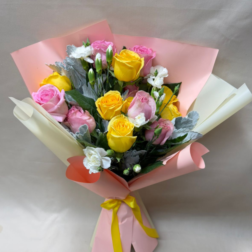 Bouquet con 14 rosas en tonos amarillo y rosa, clavelina blanca, acompañado de miller como follaje, (las tonalidades y follajes pueden variar según disponibilidad en tienda).