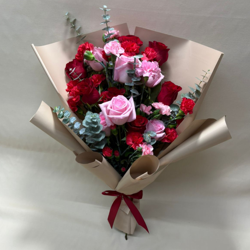 Ramo de 14 rosas, 7 rojas, 7 en tono rosa, clavelina en tonos rojo, rosa, acompañado de dolar como follaje (las tonalidades y follajes pueden variar según disponibilidad en tienda).