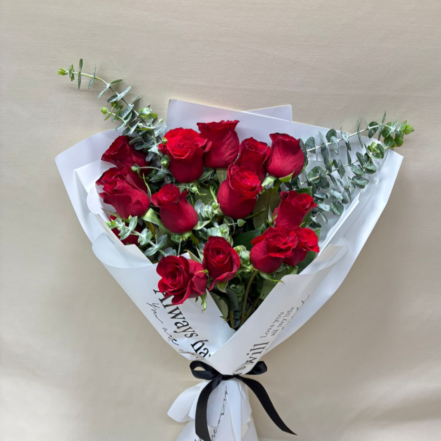 Ramo de 14 rosas rojas acompañado de dolar como follaje (las tonalidades y follajes pueden variar según disponibilidad en tienda).
