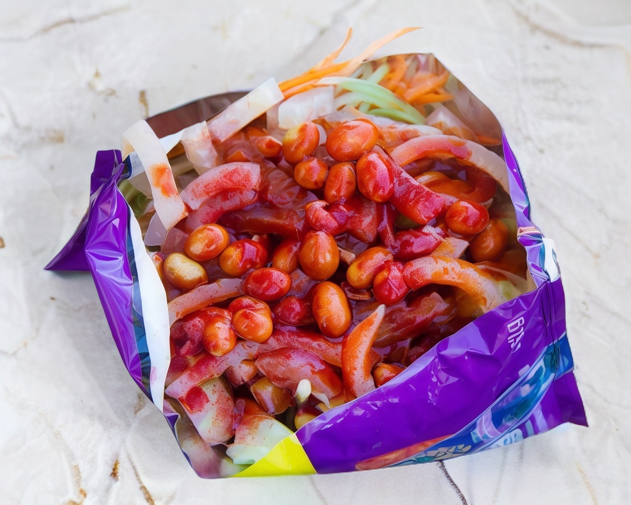 Doritos o Tostitos (61g) preparadas con jícama picada (30g), zanahoria rallada (30g), pepino picado (30g), cacahuate japones (35g), hot nuts (35g), cueritos de cerdo (60g), salsa picante (25ml), chamoy líquido (25ml), miguelito tradicional (15g), tajín clásico (10g), sal (5g) y jugo de limón (25ml). Los Doritos se envian en un empaque por separado para evitar que se humedezcan.