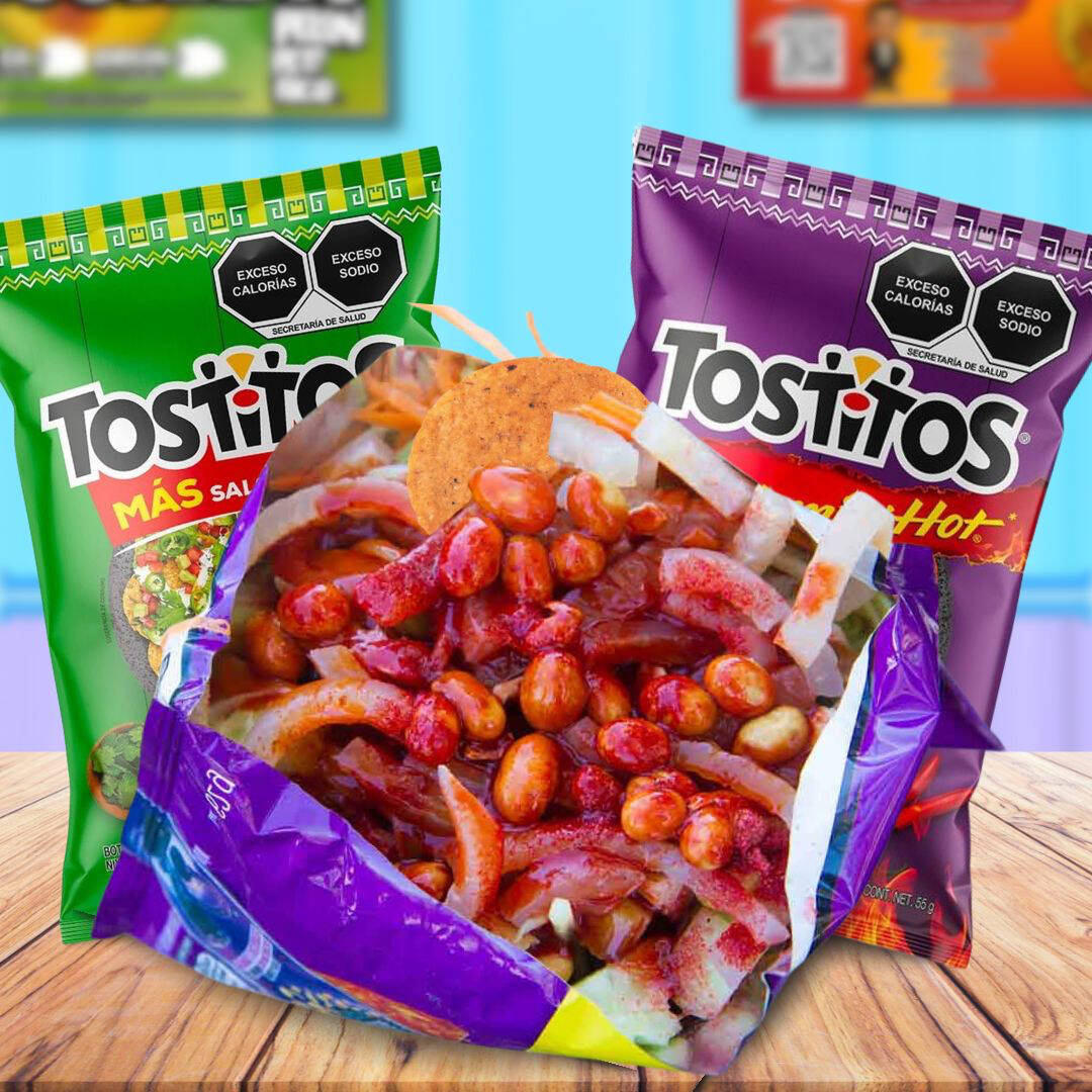 Tostitos (61g) preparadas con jícama picada (30g), zanahoria rallada (30g), pepino picado (30g), cacahuate japones (35g), hot nuts (35g), cueritos de cerdo (60g), salsa picante (25ml), chamoy líquido (25ml), miguelito tradicional (15g), tajín clásico (10g), sal (5g) y jugo de limón (25ml). Los Tostitos se envían en su empaque por separado para evitar que se humedezcan.