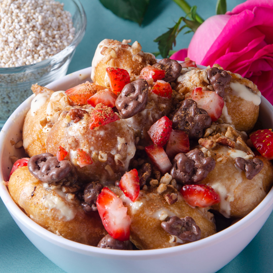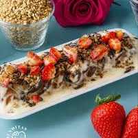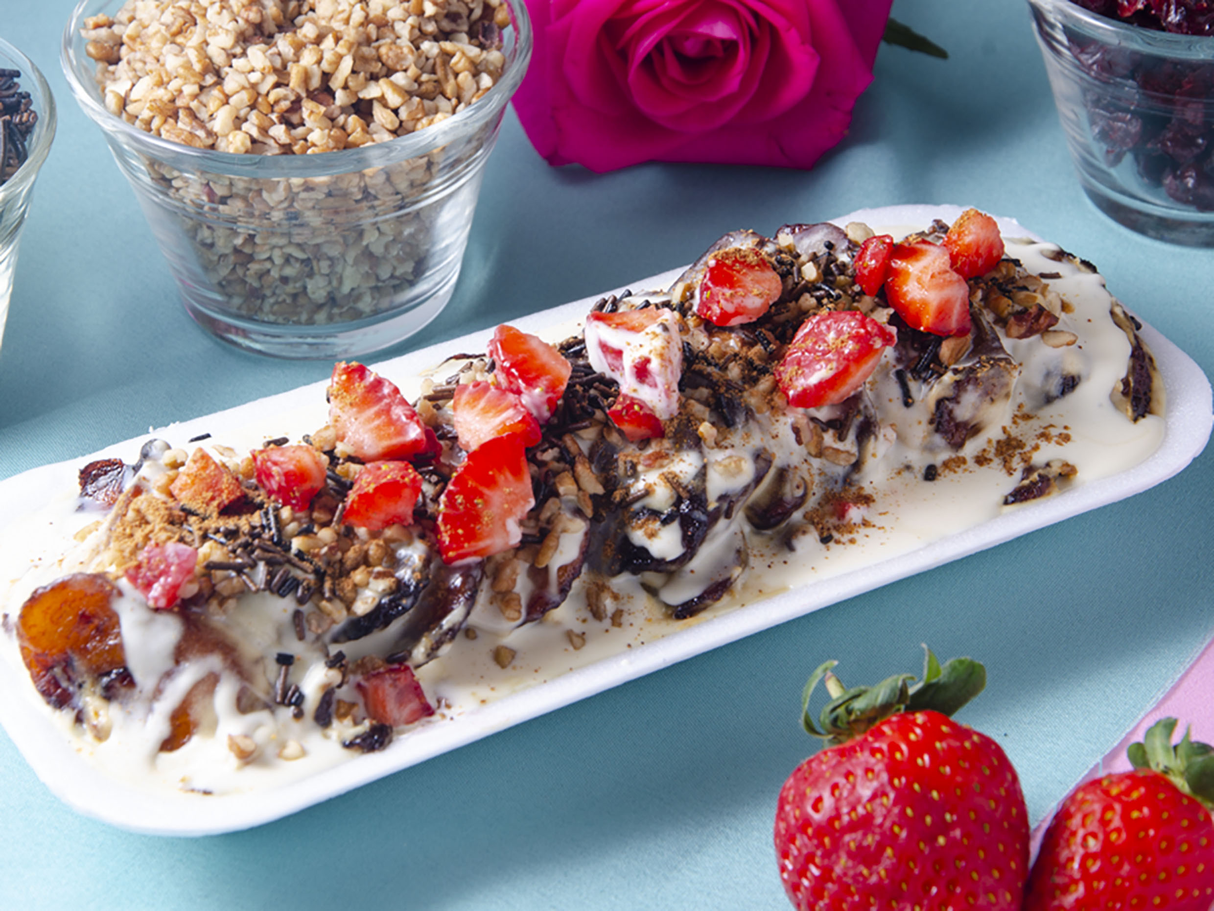 Arma tus fritos a tu antojo, plátano macho bañados en crema artesanal, un dip, dos toppings de 15 gramos de tu elección cada uno, con un toque de vainilla y canela en polvo y trocitos fresa o durazno.