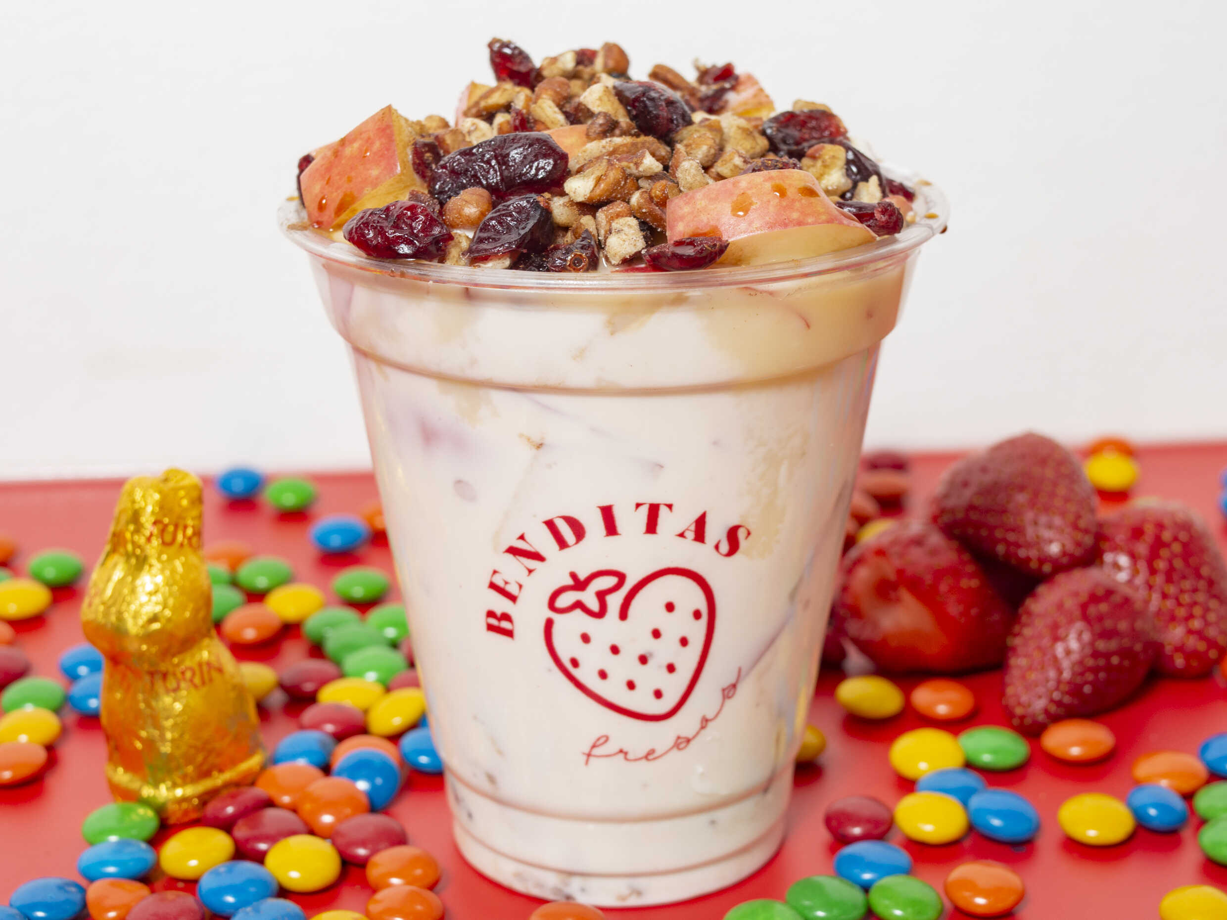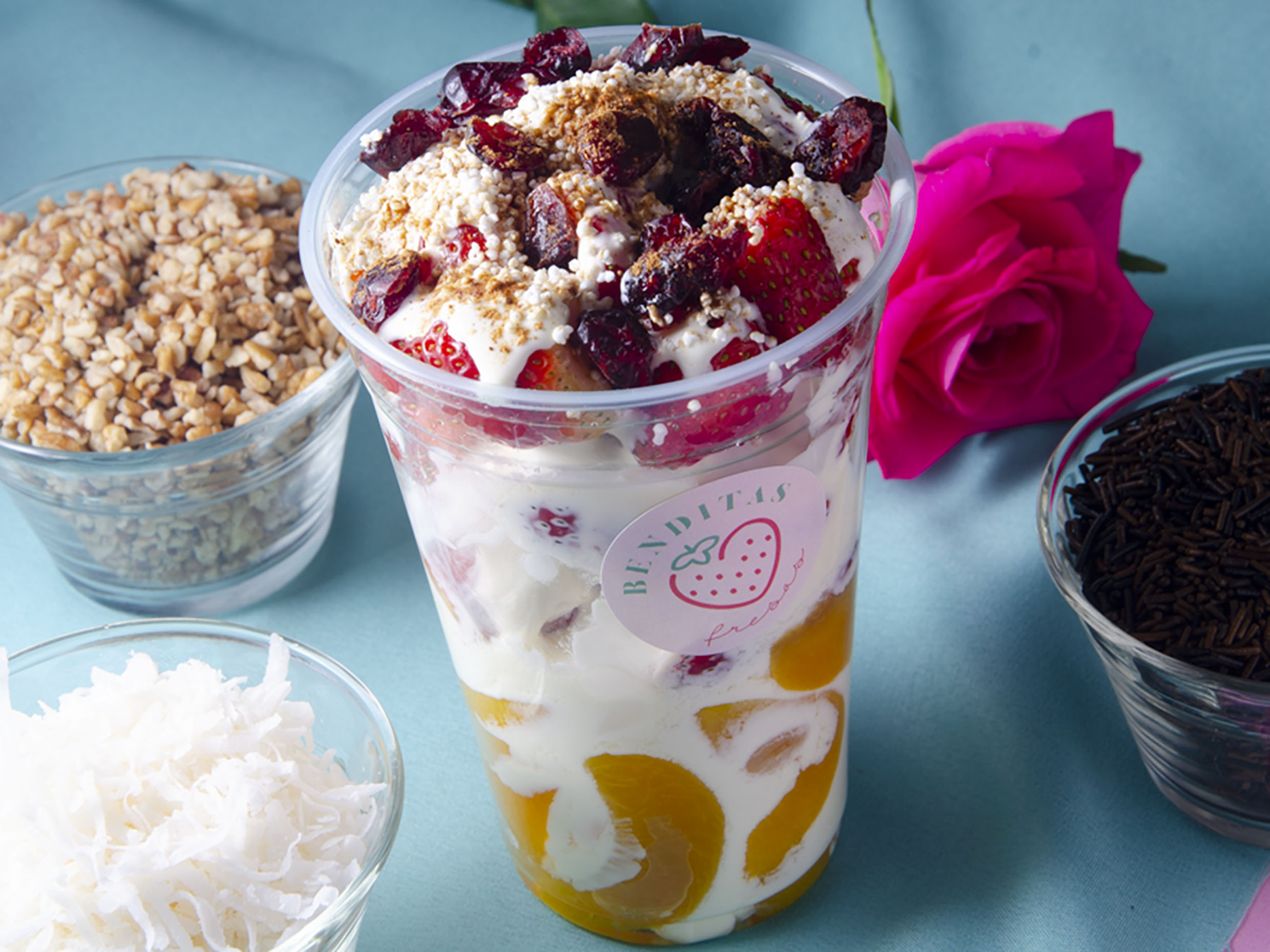 Arma tus combinados a tu antojo, combina tus frutas favoritas, bañadas en crema artesanal y 2 toppings de tu elección, con un toque de vainilla y canela en polvo, 16 onzas.