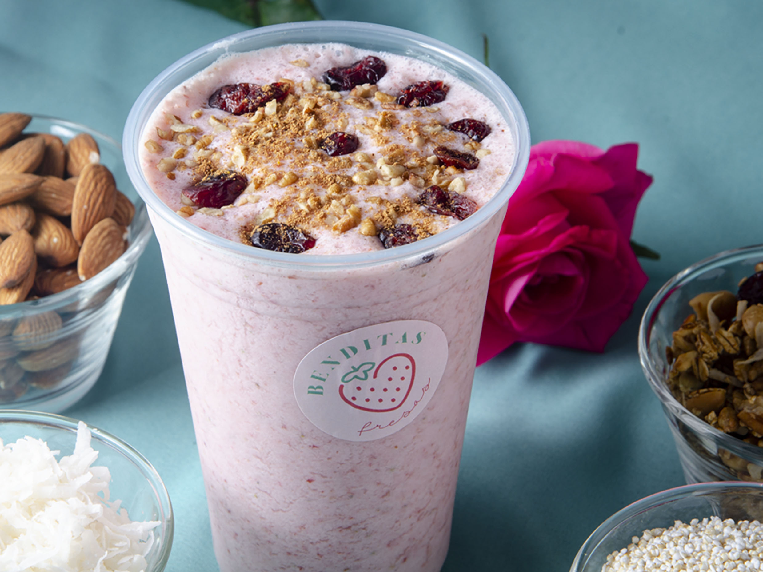 480 ml Arma tu smothie a tu gusto, preparado con tu fruta favorita, acompañada de frutos secos, granos, hielo y la leche de tu preferencia y un toque de vainilla y canela en polvo, puede ir endulzado con azúcar, stevía o sin nada de dulce.