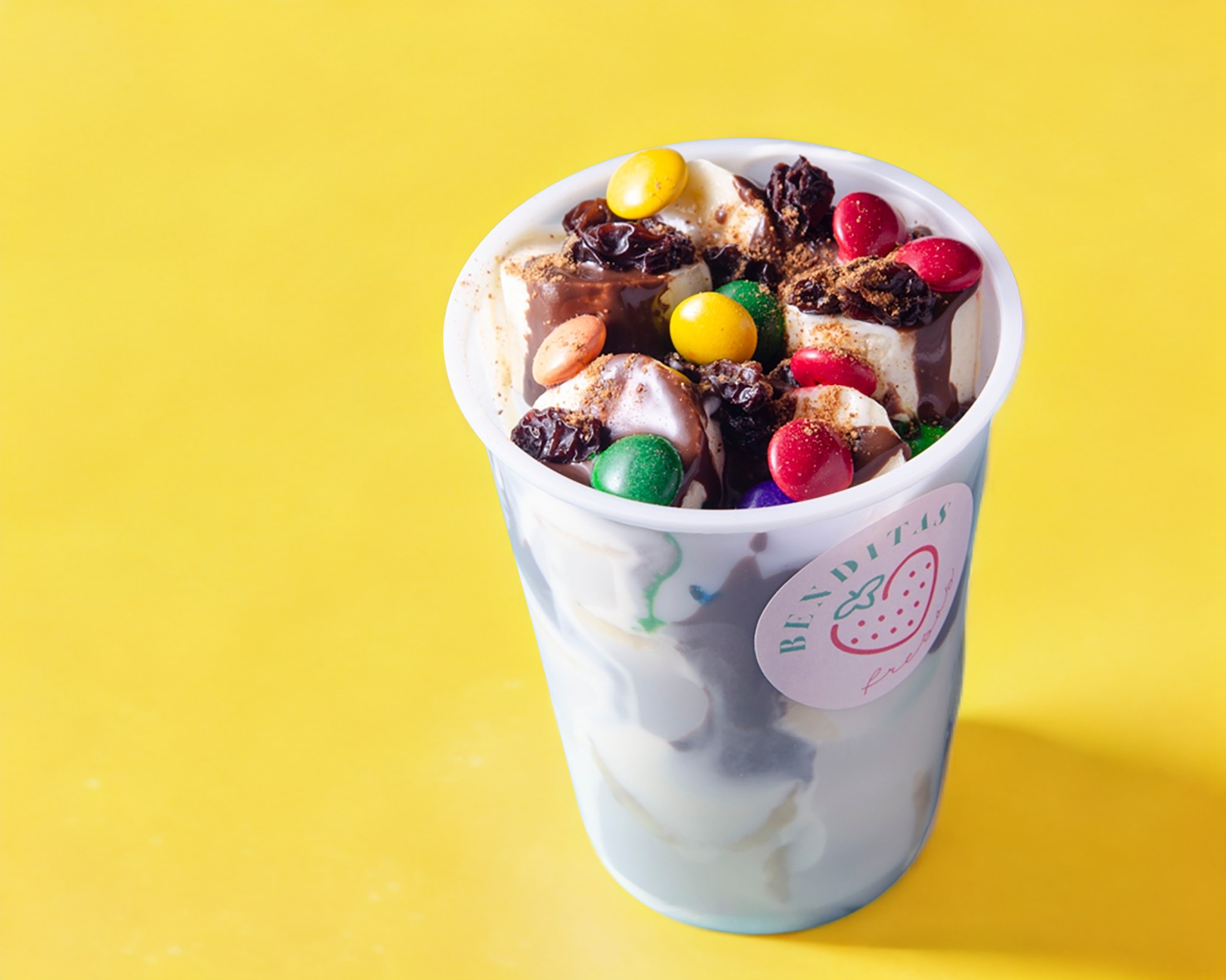 Arma tus duraznos a tu antojo bañados en crema artesanal, dip de lechera y 2 toppings de tu elección, con un toque de vainilla y canela en polvo.