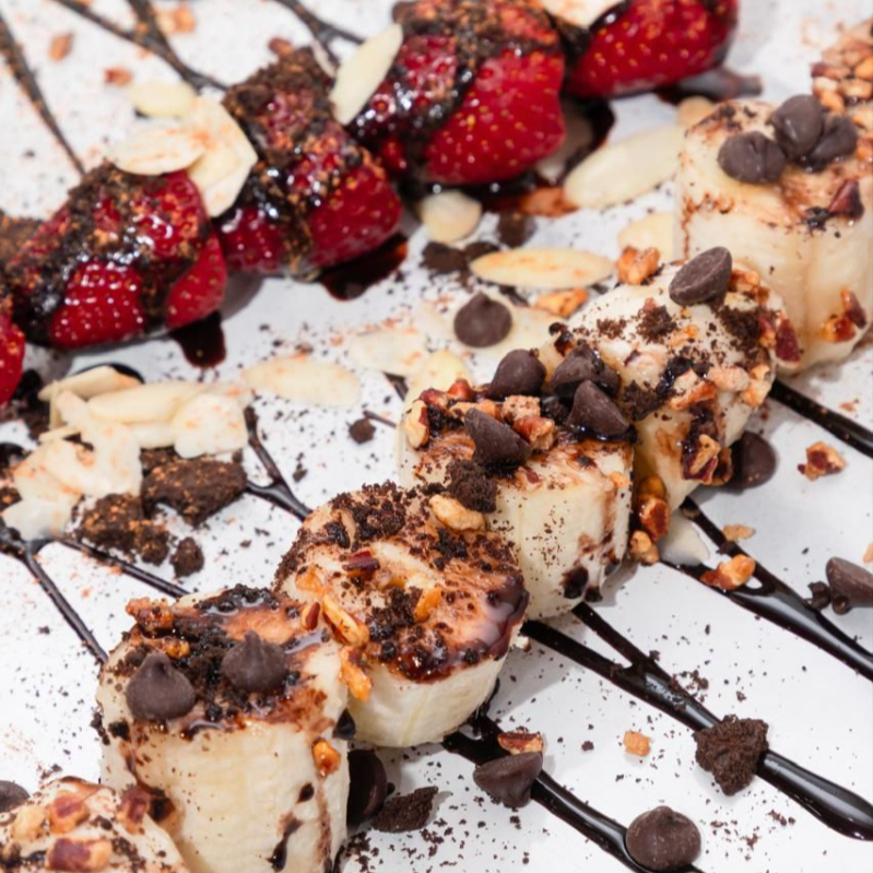 Disfruta de 2 lanzas de fruta fresca: fresa, plátano, manzana o de temporada, dales el toque dulce que más se te antoje. No incluye toppings. Imagen ilustrativa