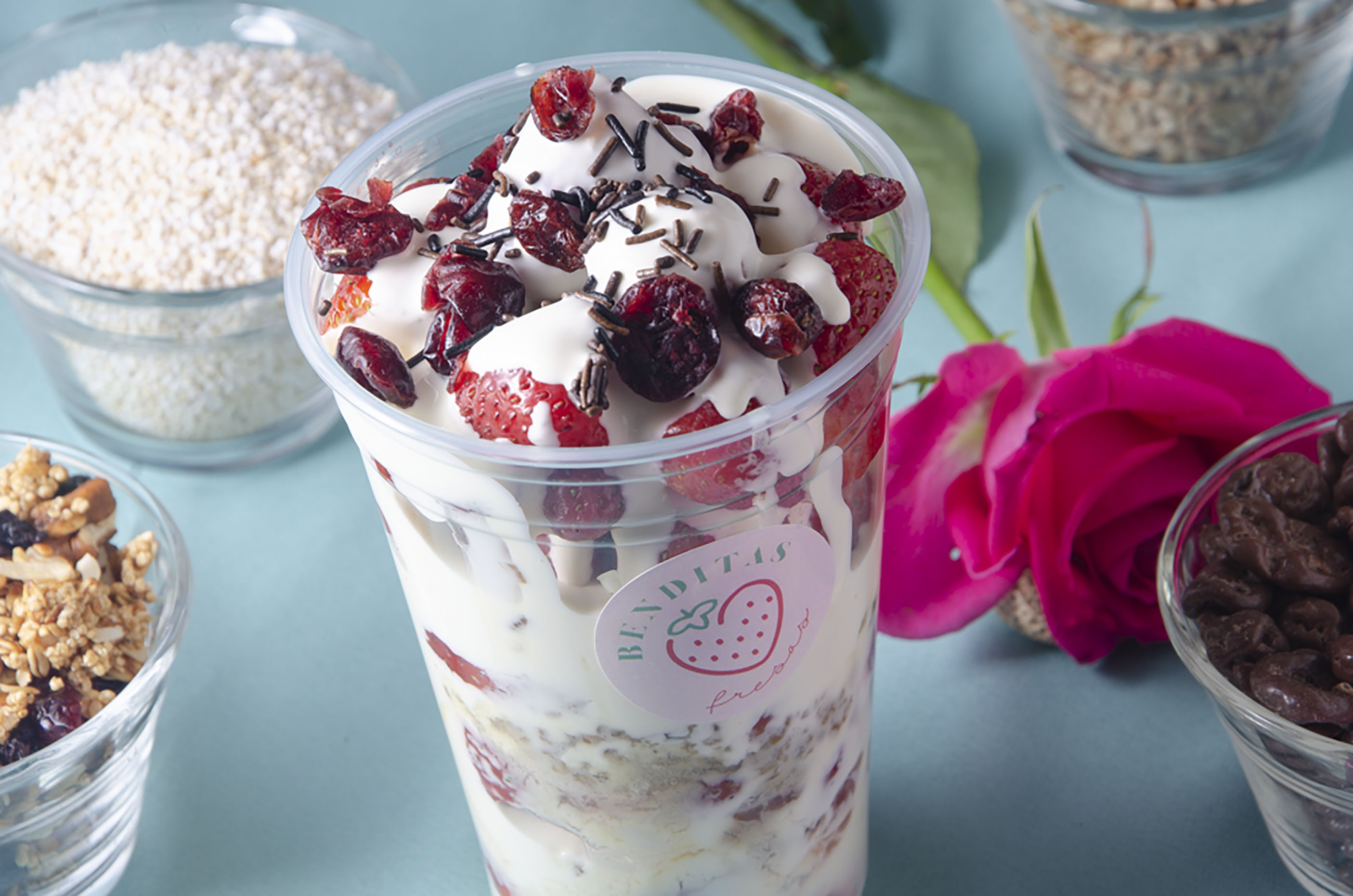 Las consentidas de la casa arma tus fresas a tu antojo, del invernadero a tu vaso bañadas en crema artesanal y 2 toppings de tu elección cada uno, con un toque de vainilla y canela en polvo.
