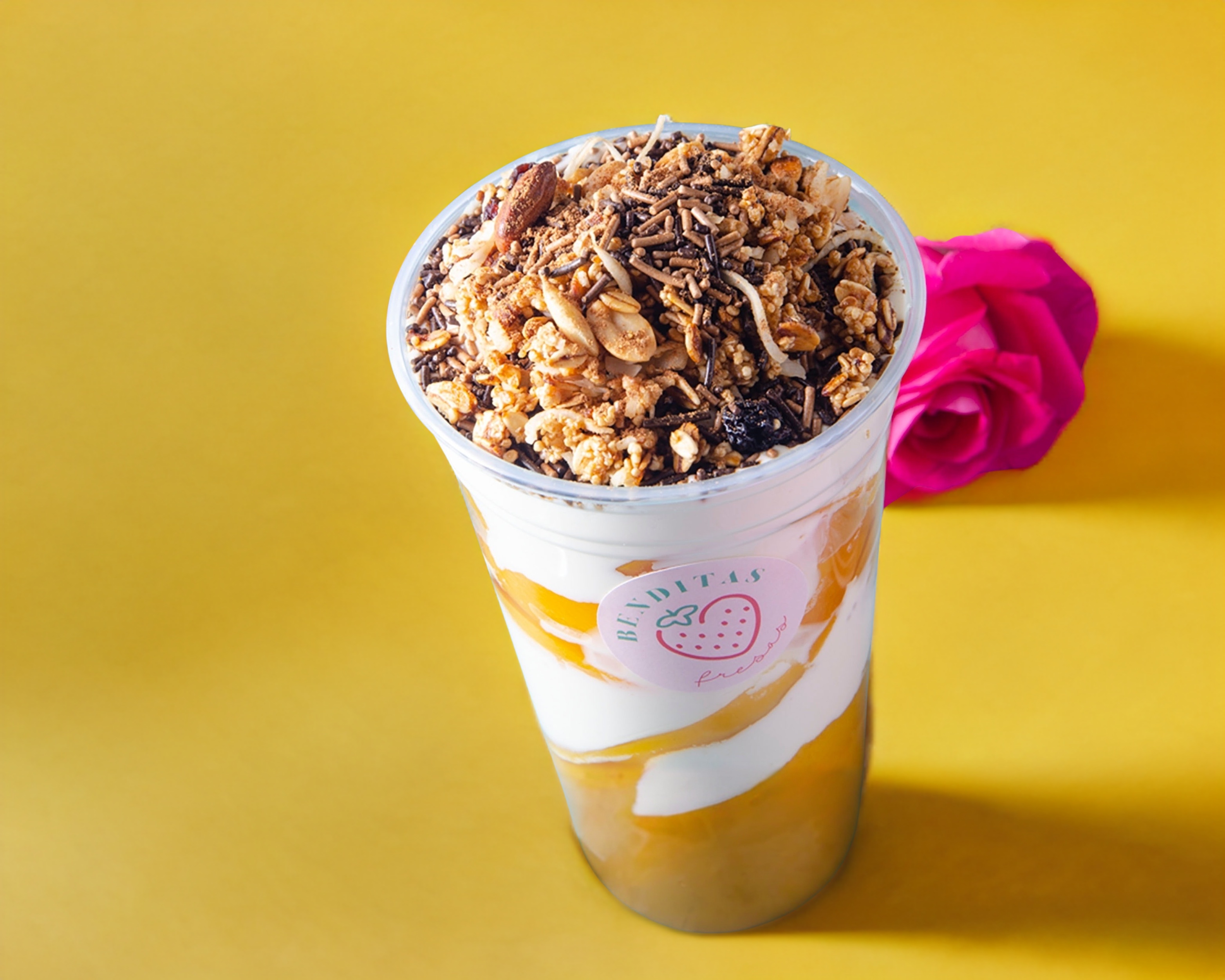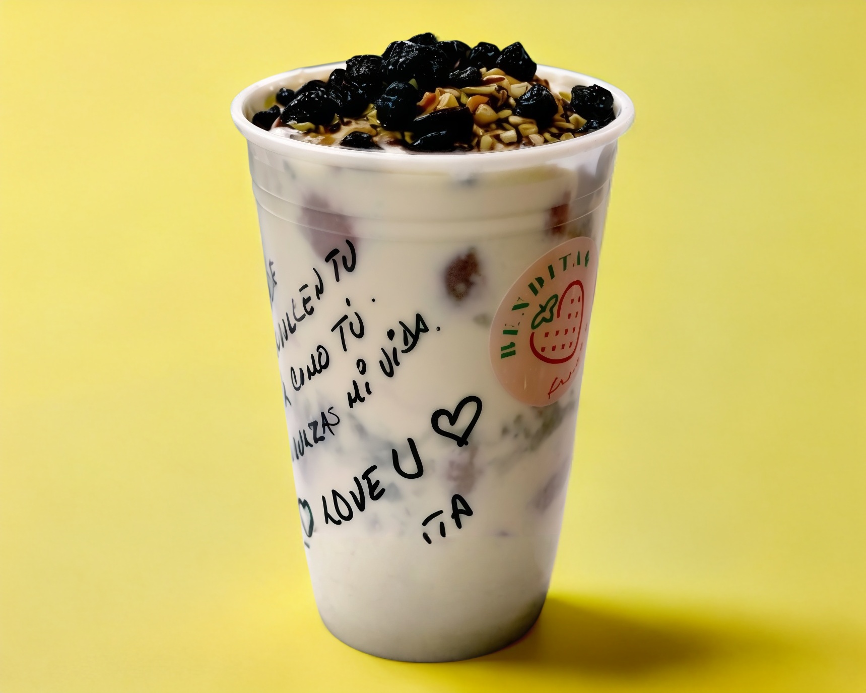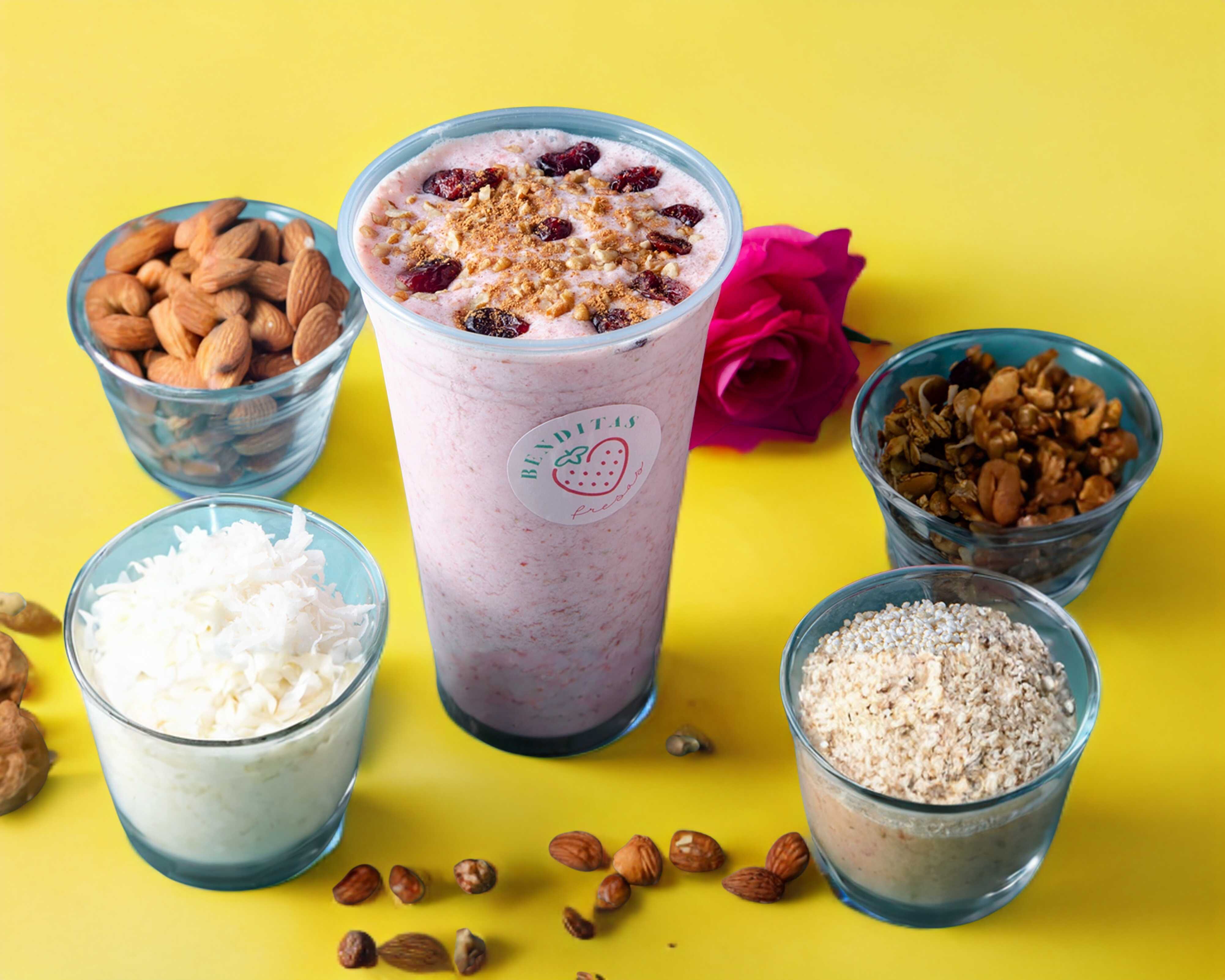 480 ml arma tu smothie a tu gusto, preparado con tu fruta favorita, acompañada de frutos secos, granos, hielo y la leche de tu preferencia y un toque de vainilla y canela en polvo, puede ir endulzado con azúcar, Stevía o sin nada de dulce.
