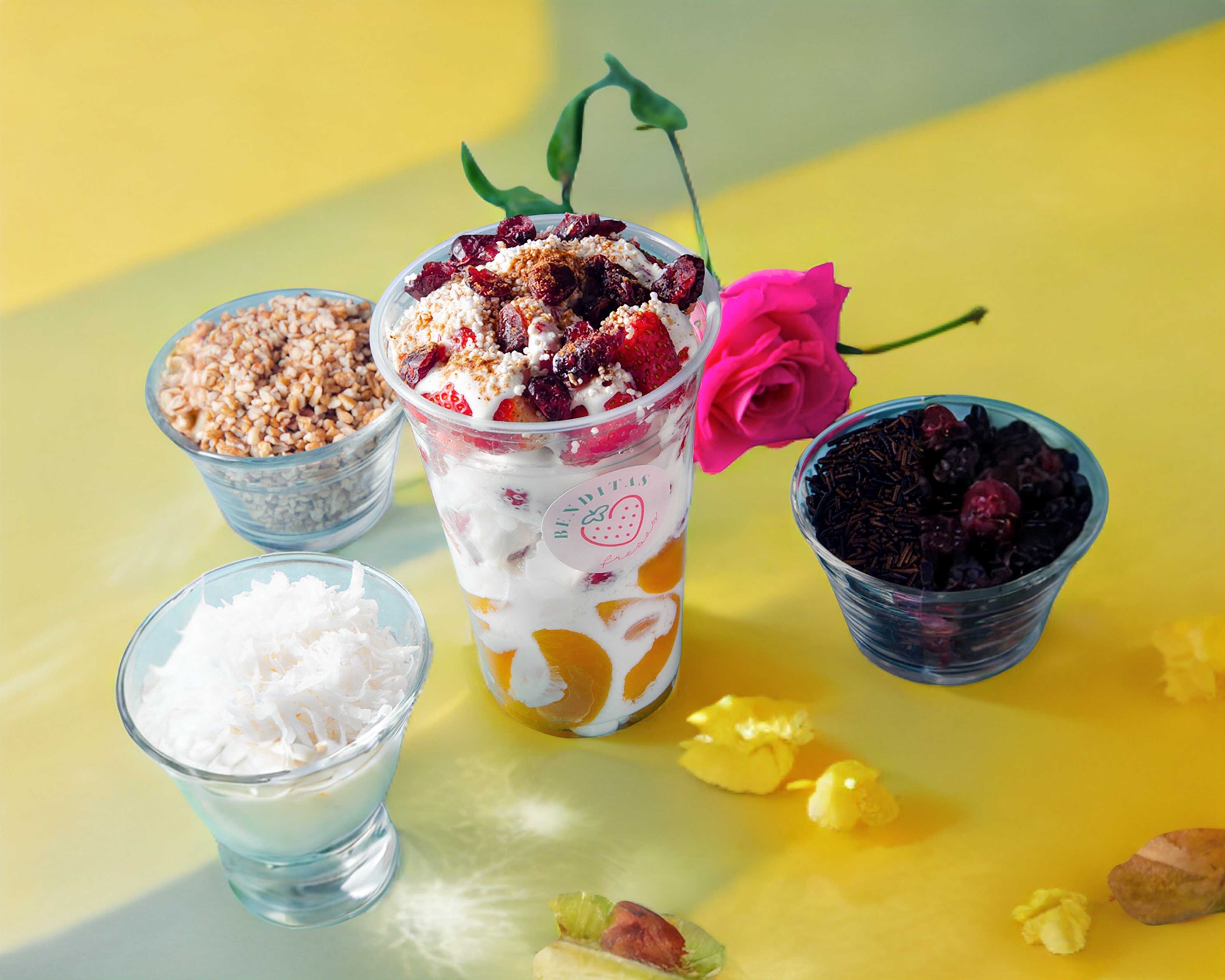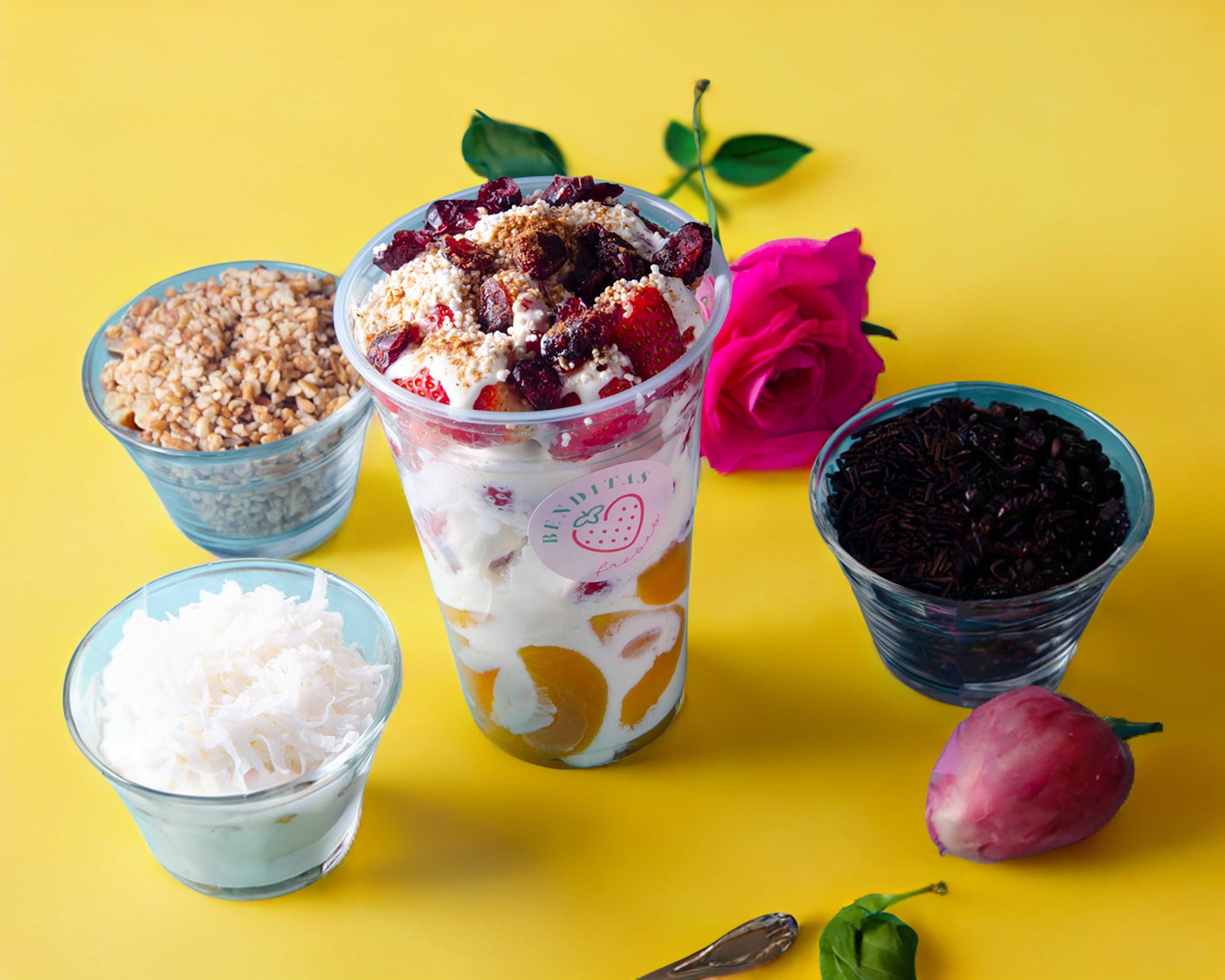 Arma tus combinados a tu antojo, combina tus frutas favoritas, bañadas en crema artesanal y 2 toppings de tu elección, con un toque de vainilla y canela en polvo.
