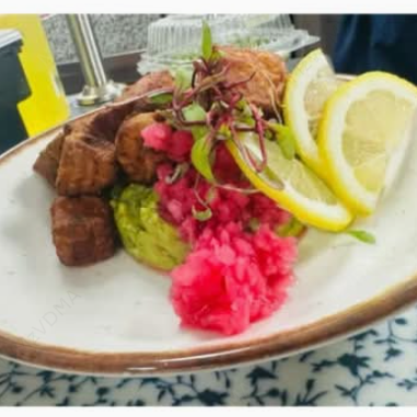 Cubos de atún rebozados acompañado de guacamole, cebolla curtida y brotes de col 180 g. Contiene pescado.