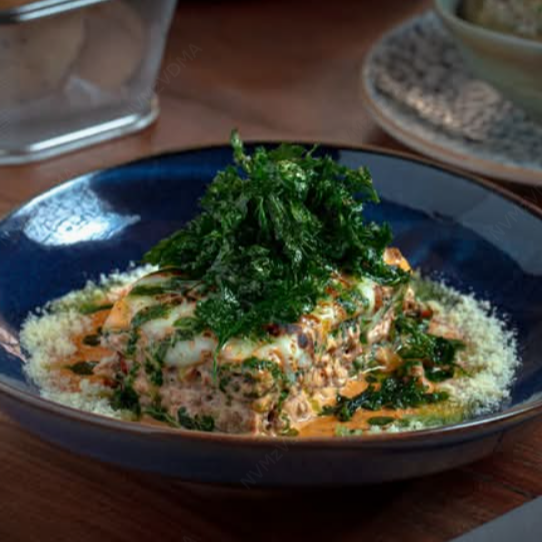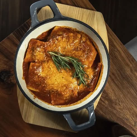 Tradicional lasaña rellena de carne, espinaca y queso ricotta. Bañada en salsa pomodoro gratinada.