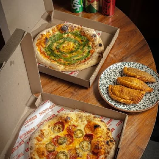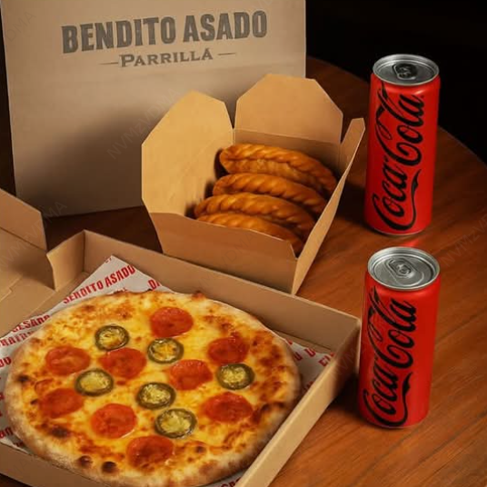 4 Empanadas, pizza pepperoni, 2 cervezas lata o refrescos lata.