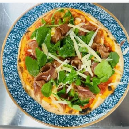 Pizza con salsa de tomate, queso mozzarella, rúcula bañada en finas hierbas y parmesano rallado 300 g.