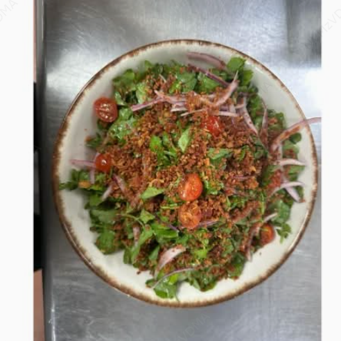 Ensalada con tocino frito, jitomate cherry, cebolla morada y bañada en vinagreta de limón.