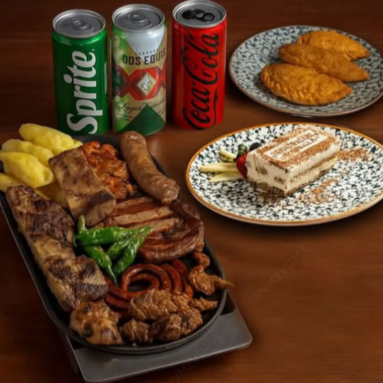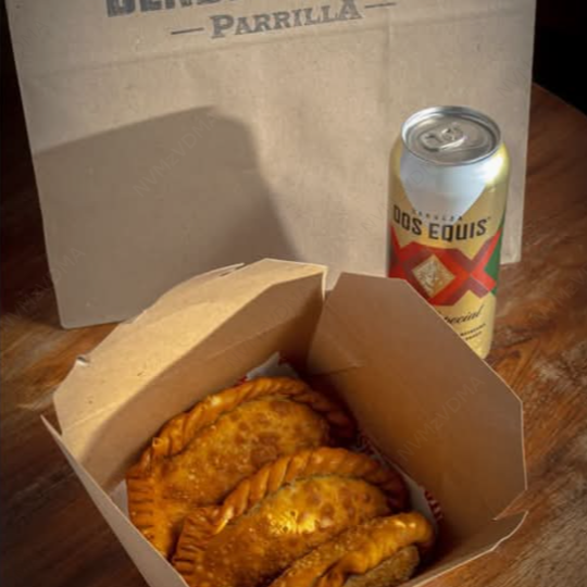 3 Empanadas, parrillada, 1 tiramisú más 3 cervezas o refrescos de lata.