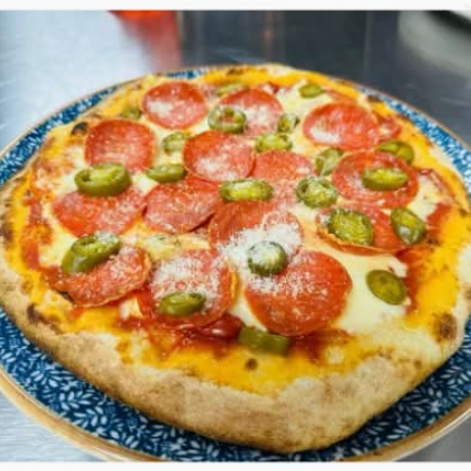 Pizza con salsa de tomate, queso mozzarella, pepperoni, chile jalapeño y parmesano espolvoreado 300 g. Picante.