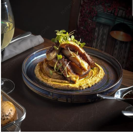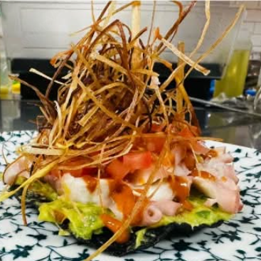 Tostada con cama de guacamole, pulpo, jitomate, cebolla morada, con una vinagreta de chipotle dulce y poro frito 140 g. Contiene mariscos. Picante.