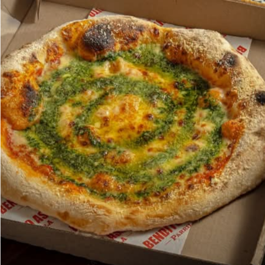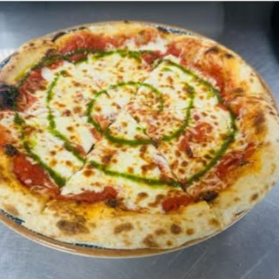 Pizza con salsa de tomate, queso mozzarella y pesto de albahaca 300 g.