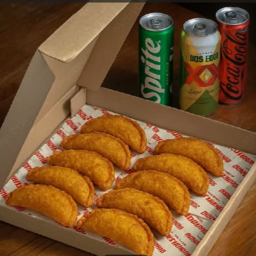 3 Empanadas,1 margarita, 1 pepperoni, 3 latas de cerveza o gaseosa.