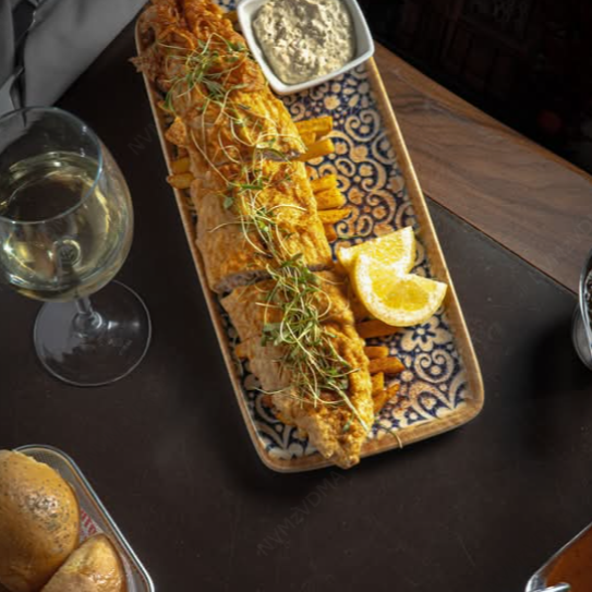 Pescado blanco en tempura, acompañado de papas francesas, tártara de alcaparras y mostaza antigua. Contiene mariscos.