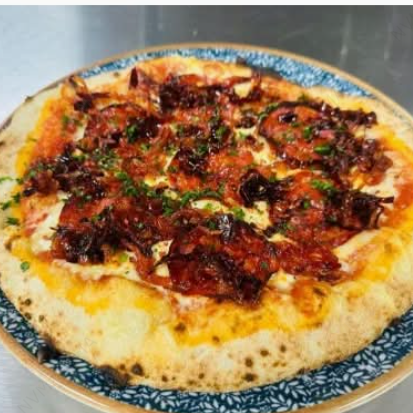 Pizza con salsa de tomate, queso mozzarella, chorizo español, mermelada de guajillo y espolvoreado de ají triturado 300 g. Picante.
