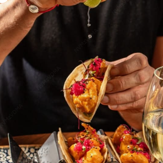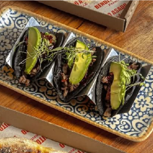 3 Tacos de camarón en tortilla de harina con salsa roja, cebolla curtida, guacamole y ajonjolí.