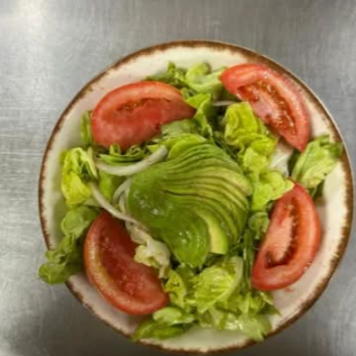 Lechuga, jitomate, cebolla, aguacate, aderezado con aceite de oliva, vinagre de vino tinto, sal y pimienta.