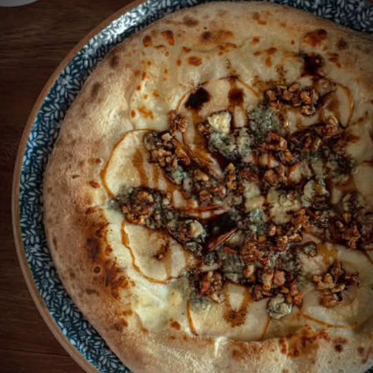Muzzarella, gorgonzolla, rodajas de pera, nueces y reducción de aceto balsámico.