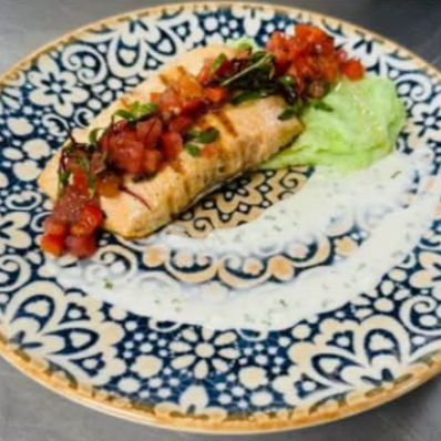 En cama de hummus, con guarnición de jitomate rostizados y papa gajo . Con un toque de aceite de cilantro. Contiene mariscos.
