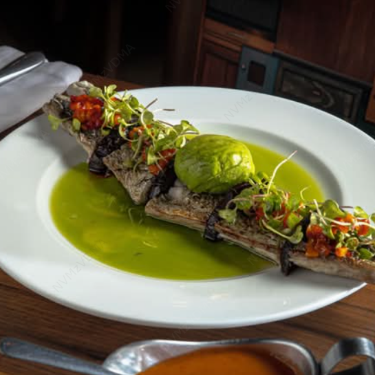 Acompañado de betabel al romero, aguacate relleno de queso mascarpone, con un toque de aceite de perejil. Contiene mariscos.
