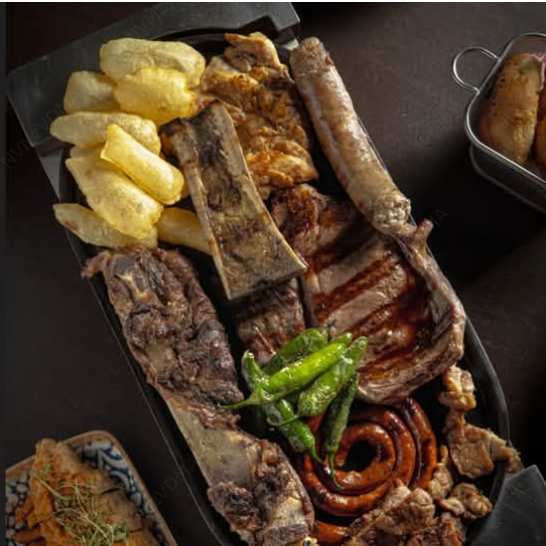 Arrachera, pechuga de pollo, chorizo, chistorra, bife de chorizo, mollejas, tuetano y costillar cargado. Con papas souffle y chiles toreados.