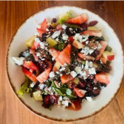 Mezcla de lechuga, fresa, mora, frambuesa, cerezas, arándanos, queso de cabra y aderezado de vinagreta de la casa.