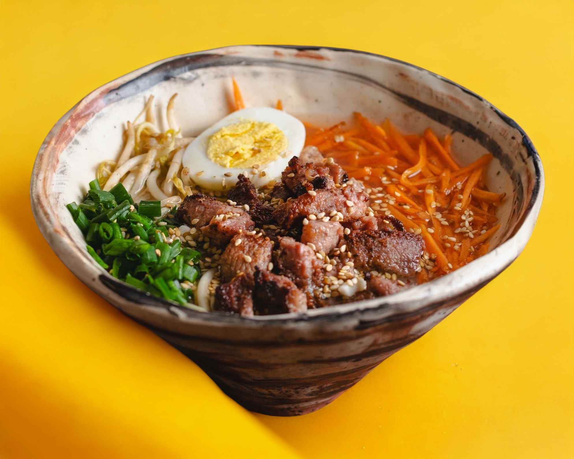 Trocitos de carne de res marinada acompañada de zanahoria rayada, germen de soya, cebollín y huevo hervido.