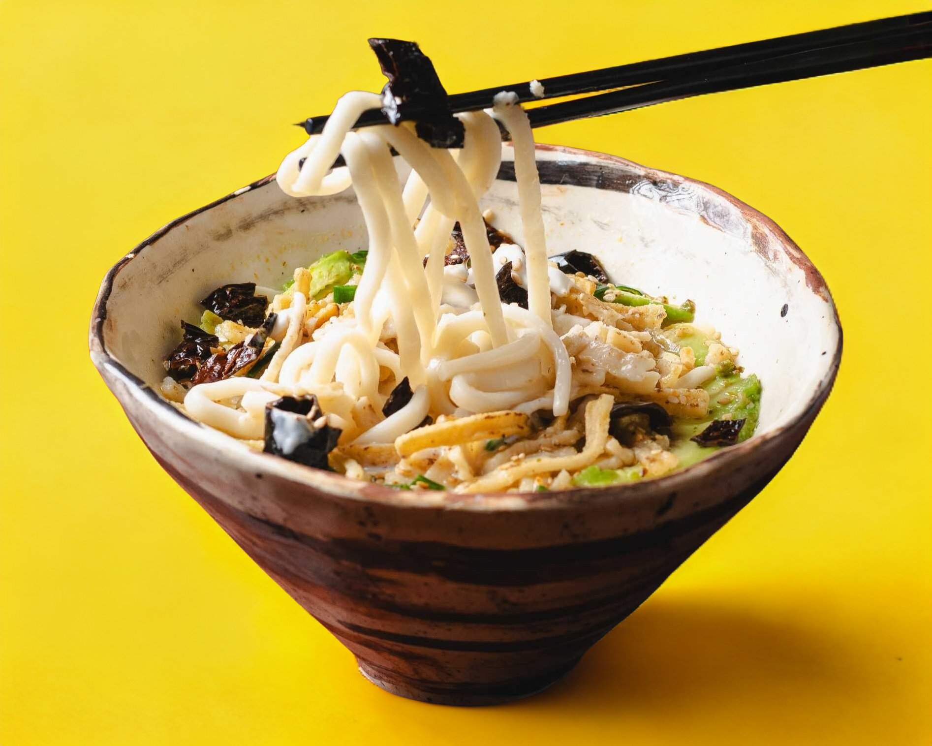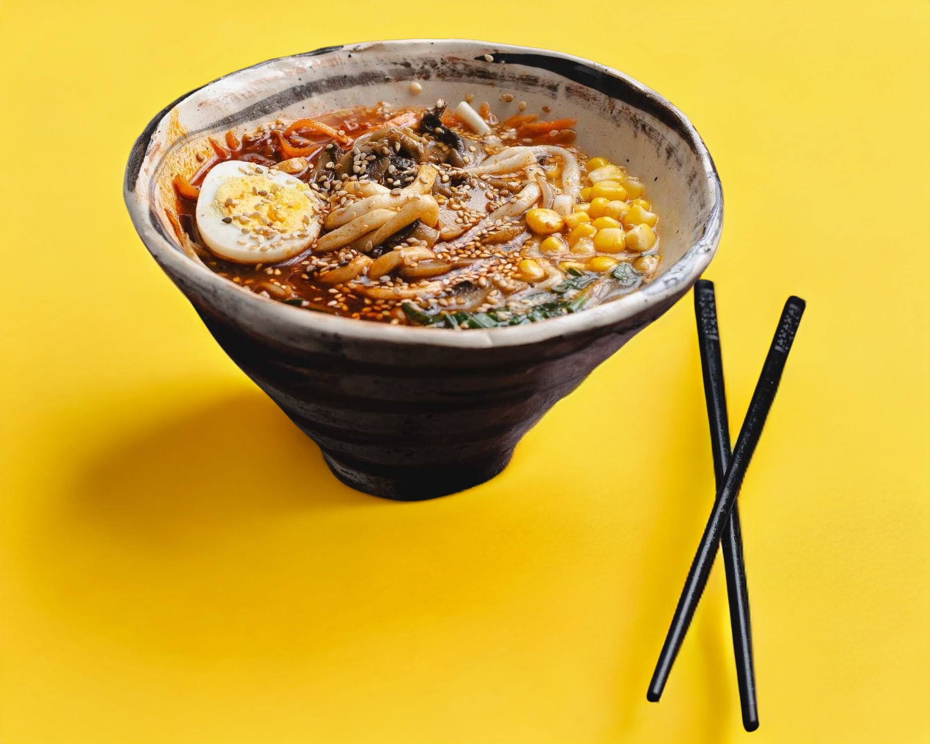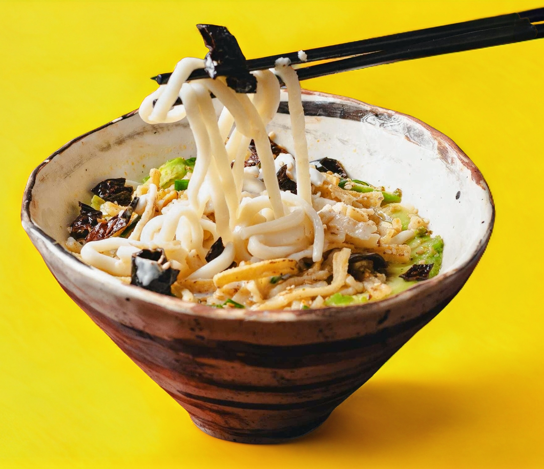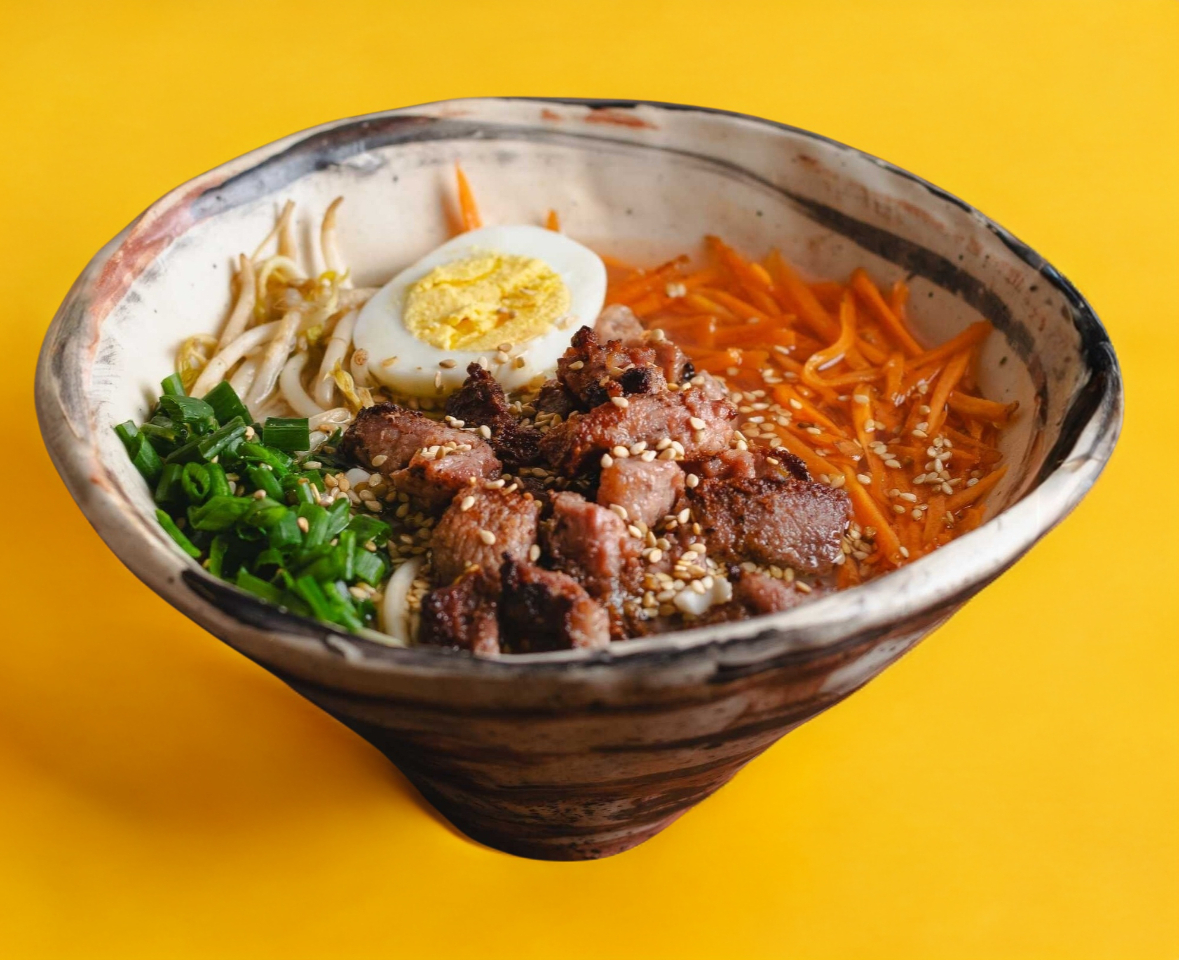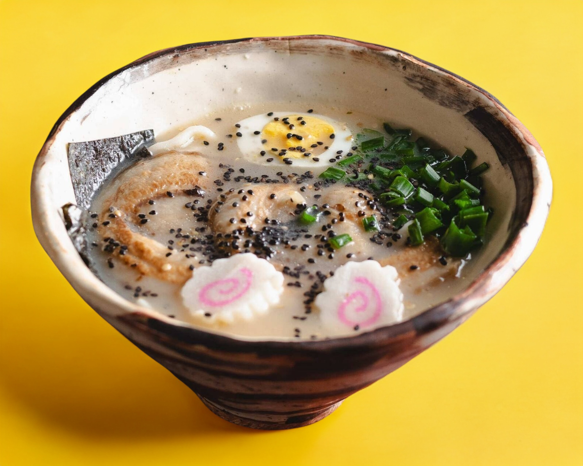 Delicioso ramen con base caldo de cerdo (tonkotsu), acompañado con medallones de panseta de cerdo, huevo hervido, alga nori, granitos de elote, cebollín y adornado con narutomaki.