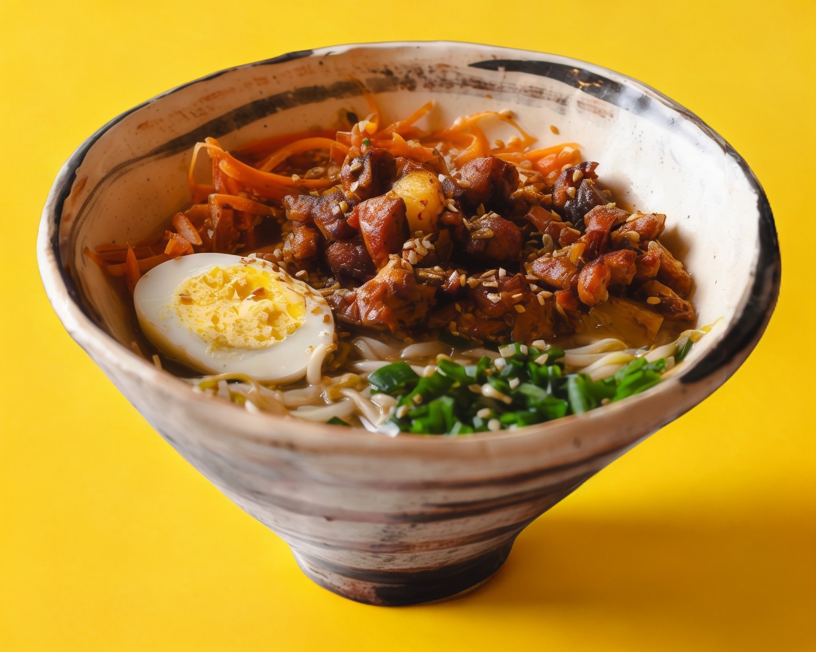 Panseta de cerdo marinada en salsa de soya, acompañada de zanahoria rayada, germen de soya, huevo hervido y cebollín.