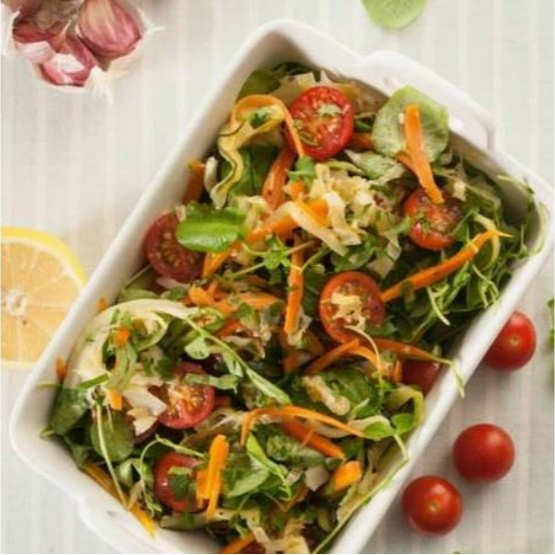 Mezcla de lechugas, verduras a las finas hierbas, queso mozzarella y vinagreta de la casa.