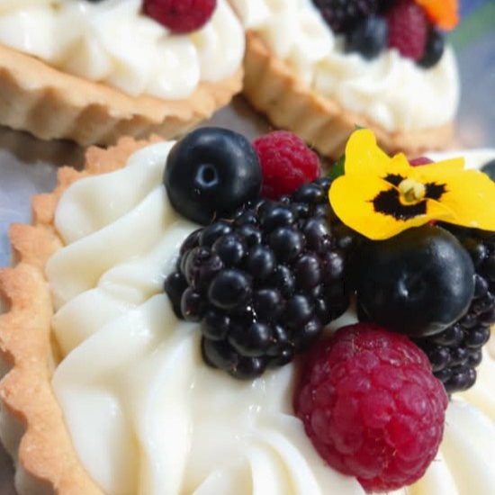 Deliciosa tarta individual de ganache de chocolate blanco con frutos rojos.