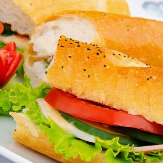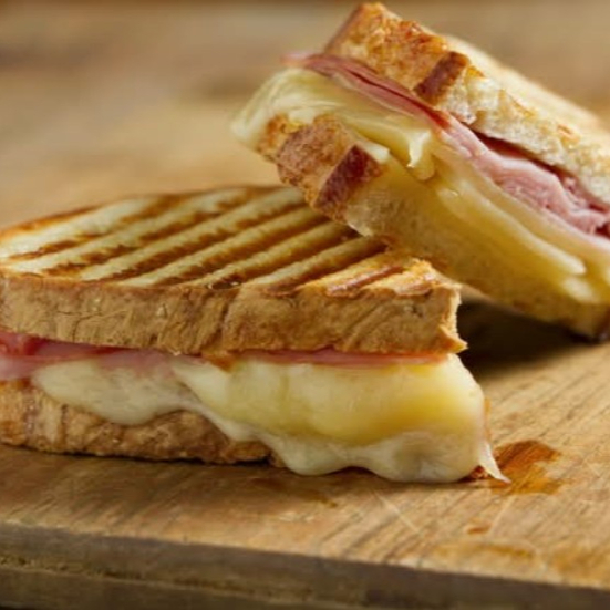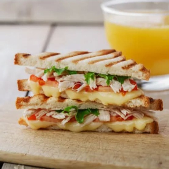 Baguette recién horneado con pollo a la plancha, queso gratinado y jamón.