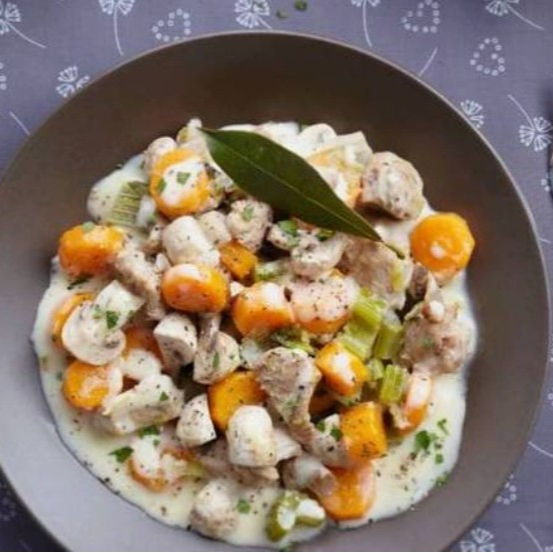 Ternera en salsa blanca, cebollitas, champiñón y zanahorias.