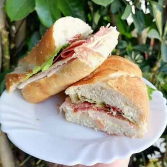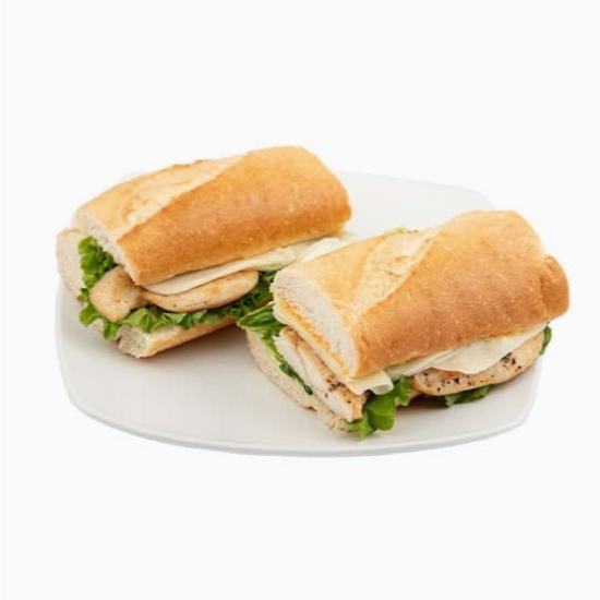 Baguette recién horneado con pollo a la plancha y queso gratinado.