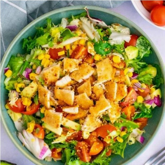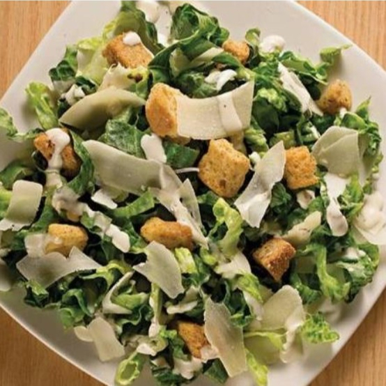 Mezcla de lechugas, crutones, aderezo y pollo a la plancha.