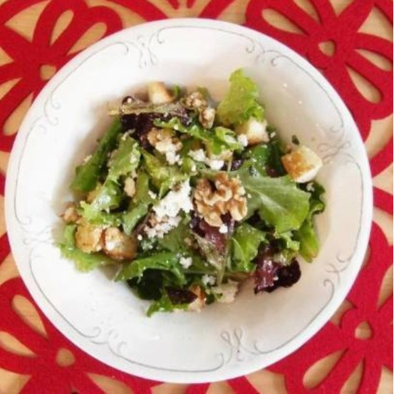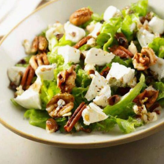 Mezcla de queso sobre cama de lechuga y nuez en trozos con vinagreta de mostaza y miel.